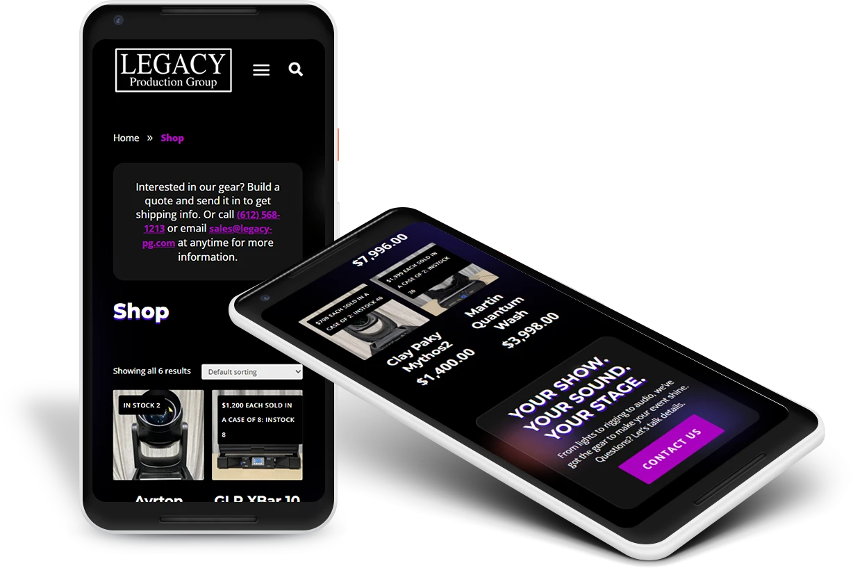 A dedicated shop section was introduced to showcase available used equipment with pricing and technical specifications. Legacy Production Group also provided a strong library of high-quality event photography, which shaped the visual direction of the site and answers the question every client has before reaching out: can they actually pull this off? That same level of proof carries through with the inclusion of a testimonial from an AC/DC production manager, a name that speaks for itself.